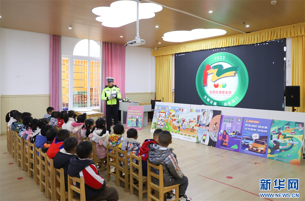 12月1日,在贵州省黔东南苗族侗族自治州丹寨县第二幼儿园,丹寨县公安局交通警察大队民警向小朋友讲解交通安全知识。新华网发(陆德华 摄)pagebreak