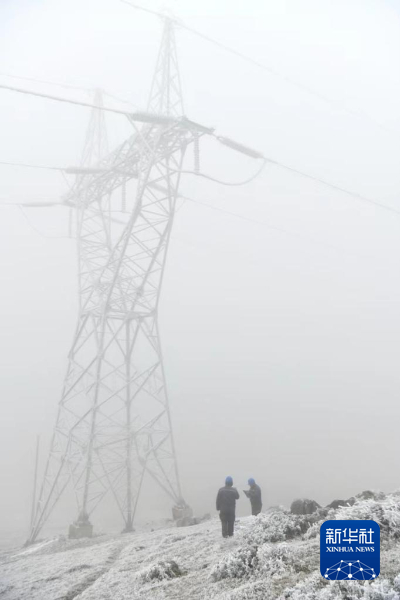 12月16日,南方电网贵州电网公司工作人员在220千伏乌威线对导线和铁塔覆冰开展观测。(罗凯摄)