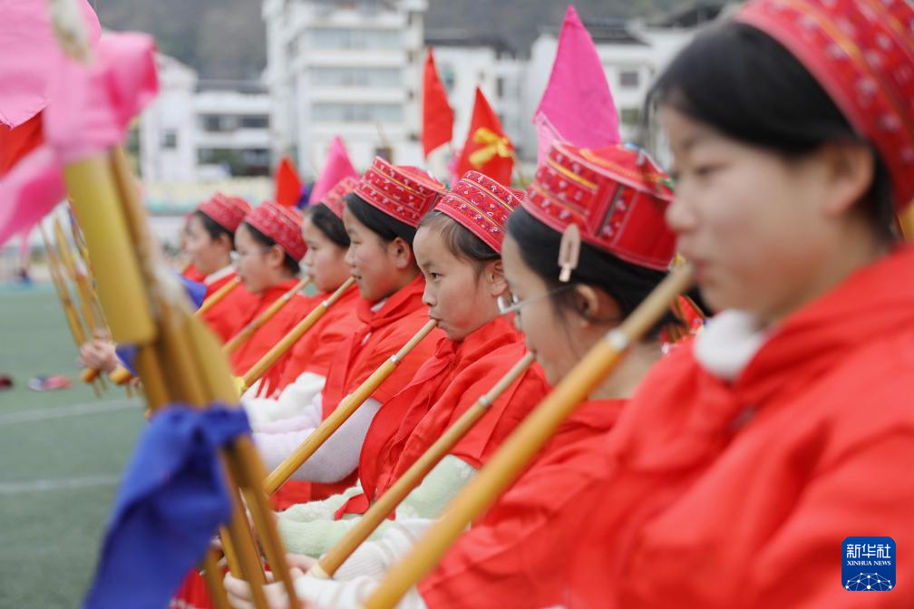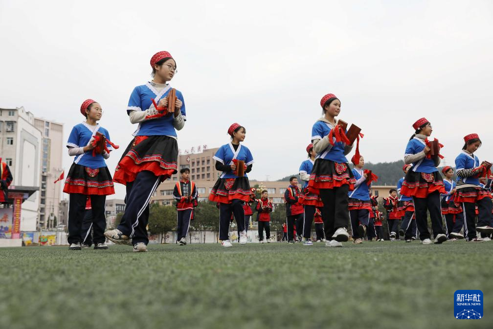12月26日,贵州省黔东南苗族侗族自治州施秉县民族中学的学生在大课间里学习吹芦笙。