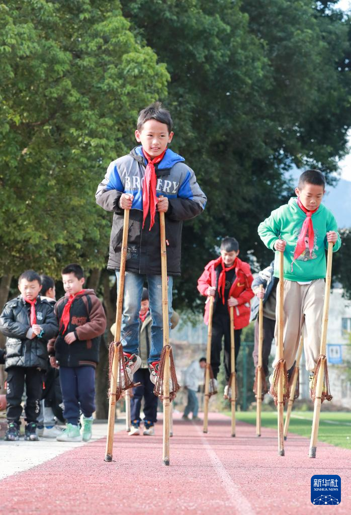 12月26日,贵州省黔东南苗族侗族自治州从江县刚边壮族乡中心小学的学生在课间活动中踩高跷。新华社发(罗京来摄)pagebreak