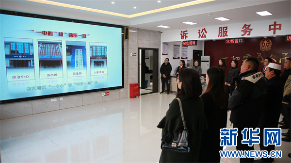 代表委员在普定白岩镇白岩综治中心观看宣传片。新华网 汪强 摄