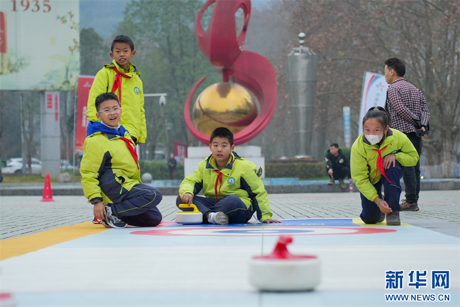 12月29日,青少年们在遵义市凤凰山广场开展冰壶竞技展示。新华网发(龙建睿 摄)