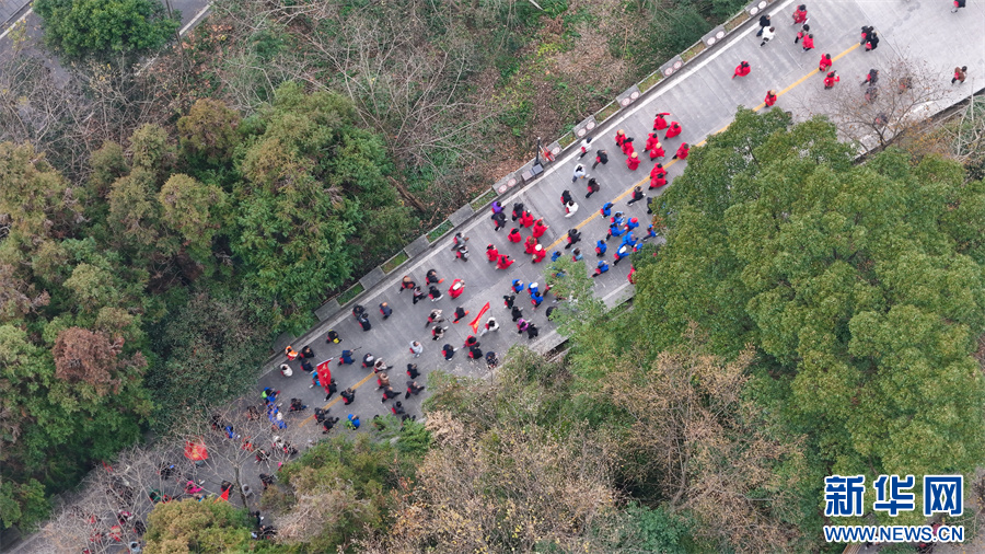 12月29日,登高爱好者沿着步道攀登遵义市凤凰山国家森林公园(无人机照片)。新华网发(龙建睿 摄)pagebreak