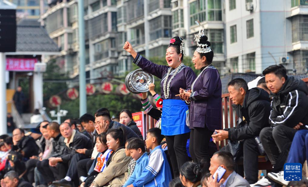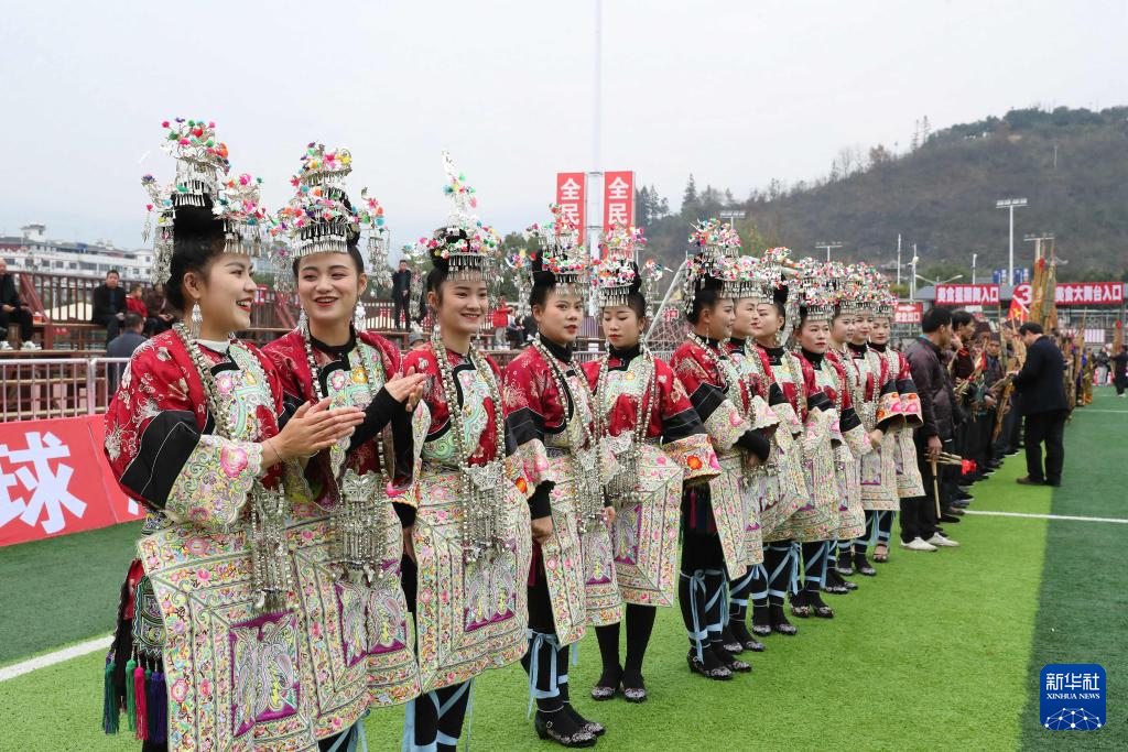 1月6日,在贵州省榕江县“村超”球场,啦啦队准备表演民族节目。新华社发(李长华摄)
