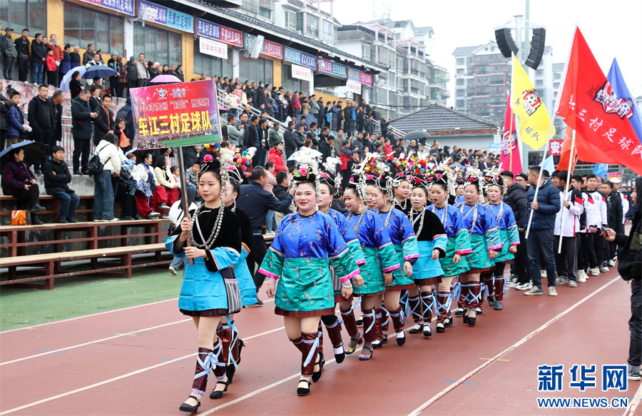 1月6日,在贵州省黔东南苗族侗族自治州榕江县“村超”足球场,拉拉队在巡游入场。新华网发(李长华 摄)pagebreak
