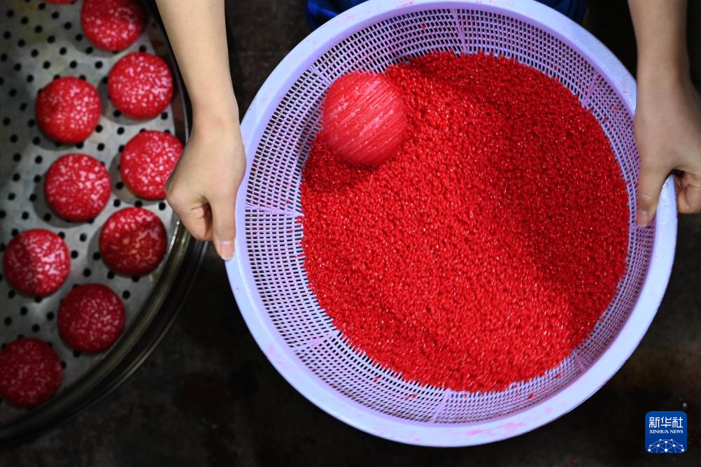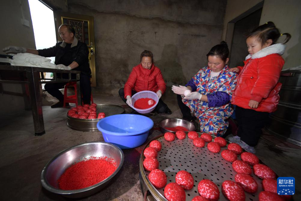 在贵州省玉屏侗族自治县,许多侗族群众从农历冬月末、腊月初开始陆续制作红粑,迎接新年的到来。红粑以糯米等为原料,经过碎米、打芡、滚红上色、揉捻、蒸制等工序制作而成,象征团圆、美满,是侗族群众的传统年味美食。
