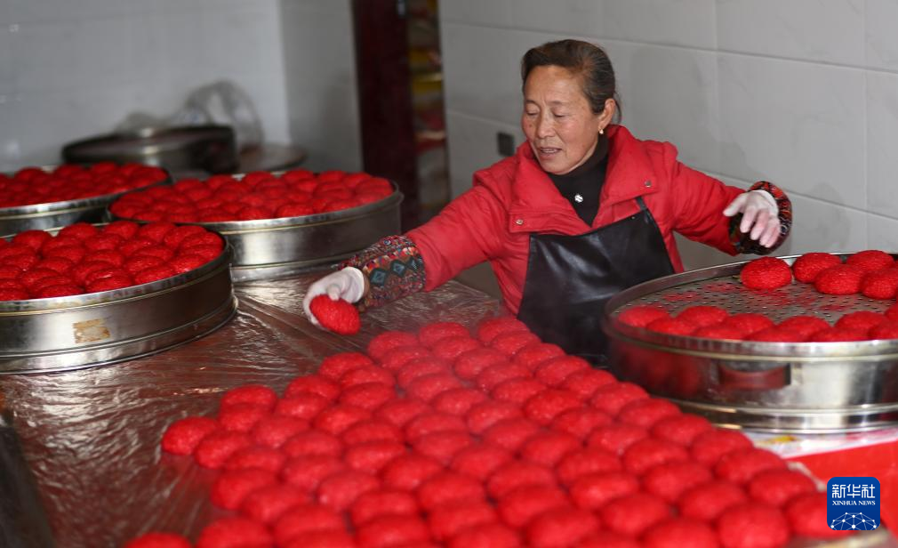 1月7日,贵州省玉屏侗族自治县田坪镇白果村村民在给红粑上色。新华社记者 杨楹 摄
