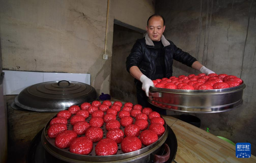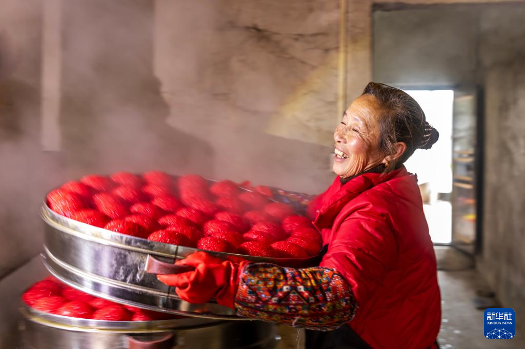 1月7日,贵州省玉屏侗族自治县田坪镇白果村村民在蒸制红粑。新华社记者 杨楹 摄
