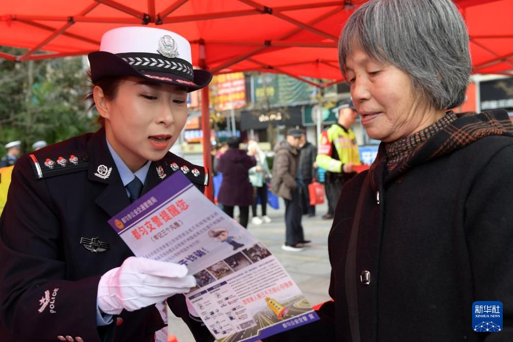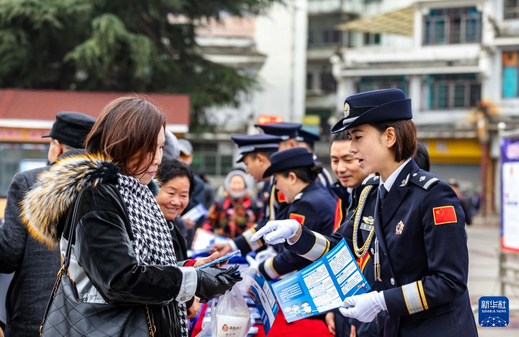 1月10日,在贵州省黔西市水西广场,警察向市民发放宣传资料。新华社发(范晖 摄)