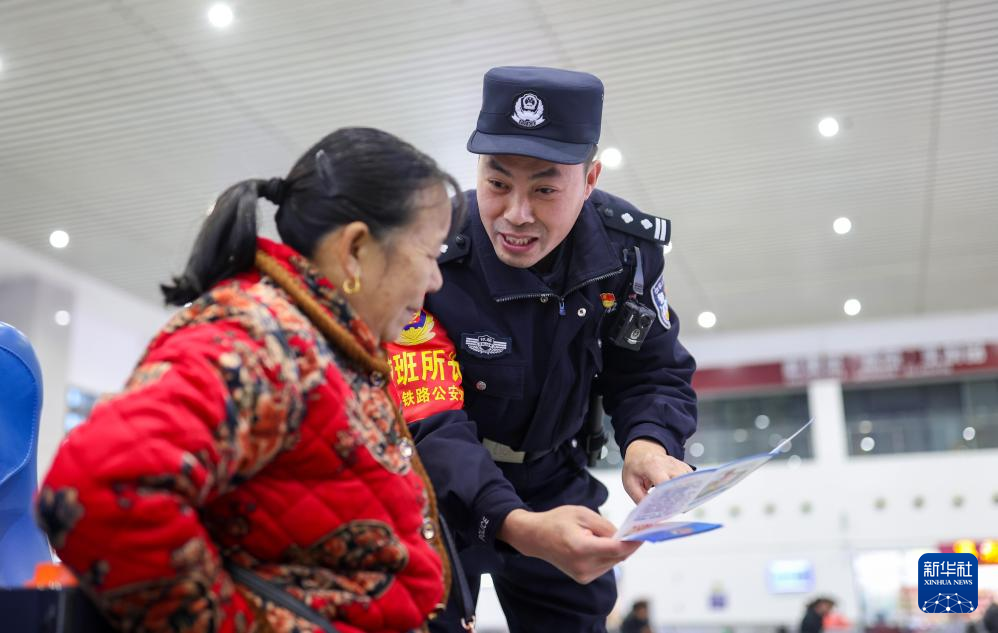1月10日,成都铁路公安局贵阳公安处铜仁南车站派出所民警向旅客宣传铁路安全知识。新华社发(胡攀学 摄)pagebreak