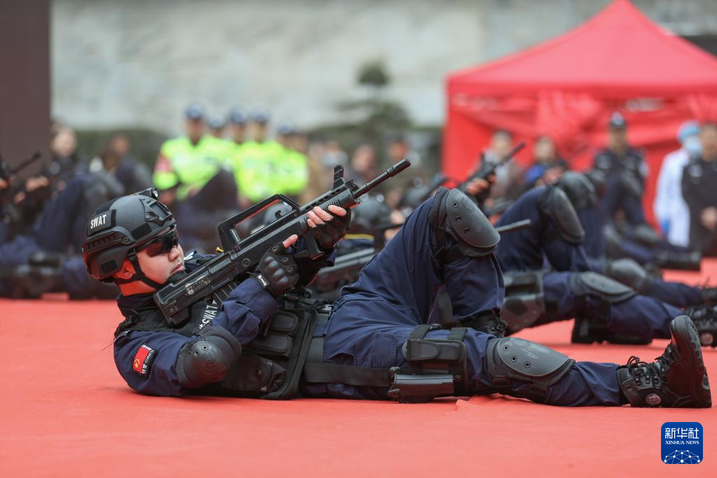 1月10日,在贵州省黔南布依族苗族自治州都匀市,特警队员在展示训练内容。新华社发(肖伟 摄)pagebreak
