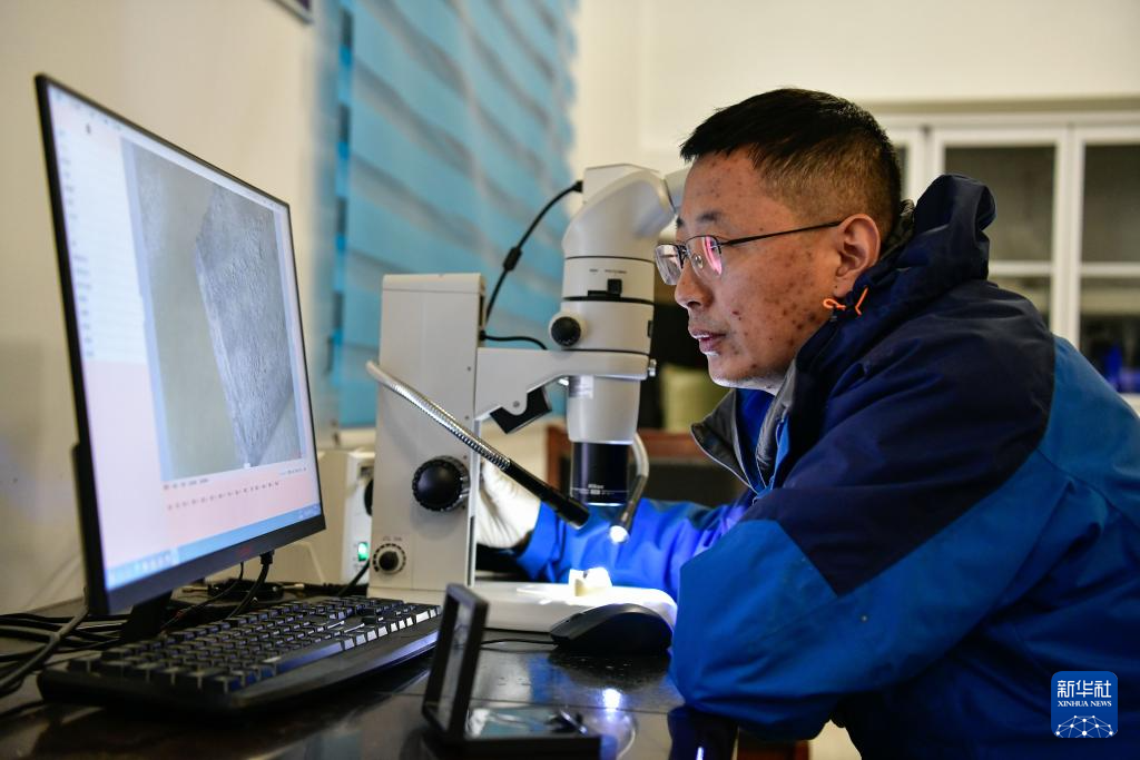 1月24日,在贵州省文物考古研究所穿洞工作站,贵州省文物考古研究所副所长张兴龙在使用显微镜观察穿洞遗址出土的考古标本。新华社记者 杨文斌 摄