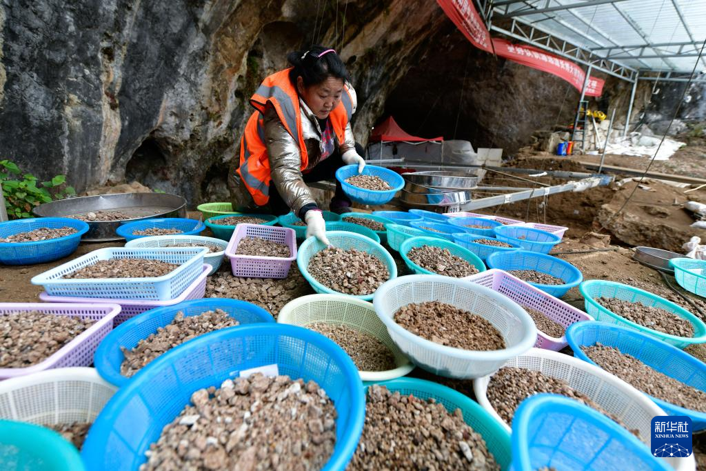 1月24日,在贵州普定穿洞遗址,考古工作者在整理筛出遗物。新华社记者 杨文斌 摄pagebreak