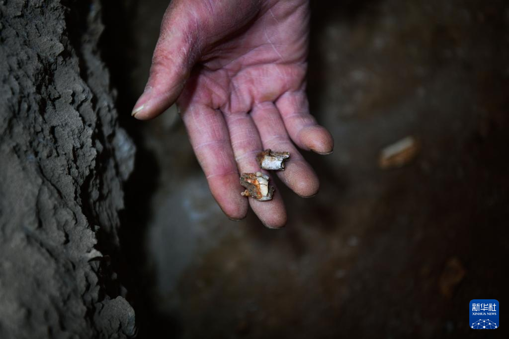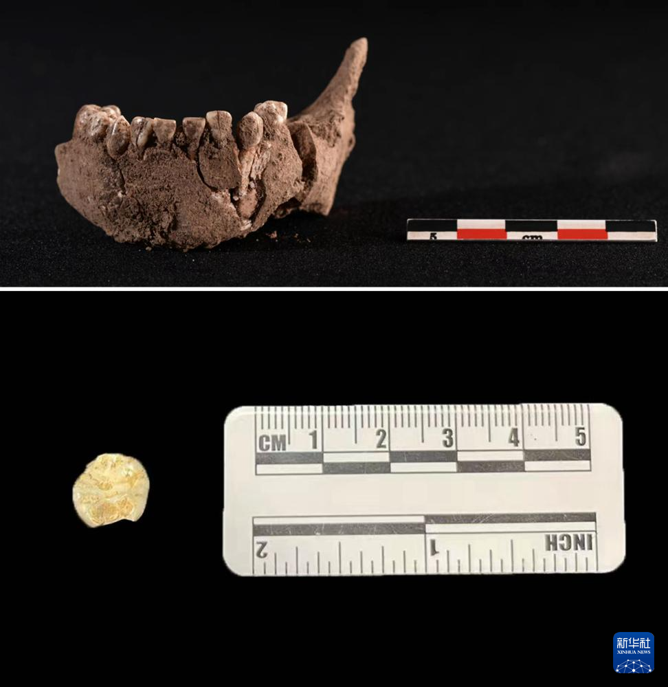 拼版照片:这是贵州普定穿洞遗址考古现场出土的人类下颌和牙齿考古标本(资料图片)。新华社发(贵州省文物考古研究所供图)pagebreak