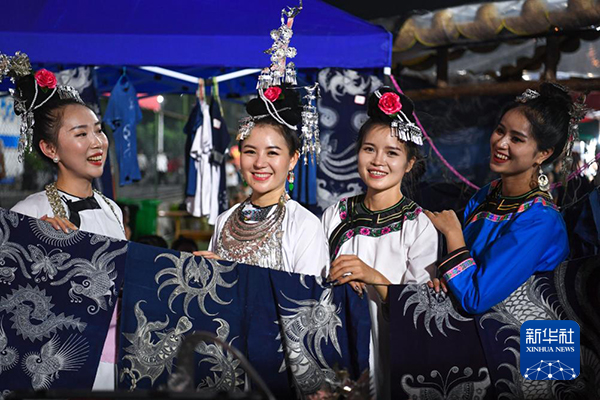 2023年6月30日,村民在贵州“村超”足球赛场旁的文创摊位展示民族服饰。新华社记者 杨文斌 摄