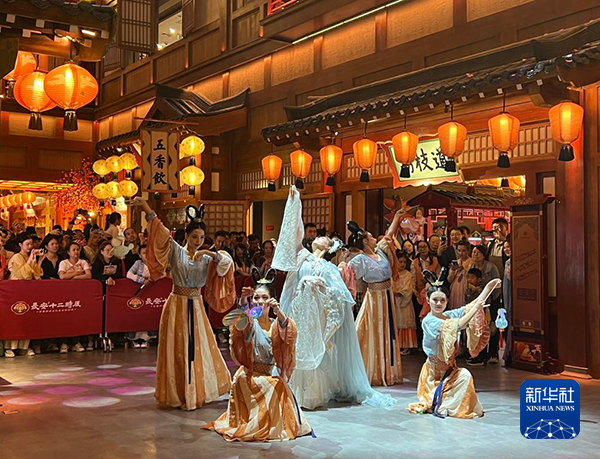 2023年9月29日,西安长安十二时辰主题街区里,怀抱玉兔的“嫦娥”与手提花灯的“月宫仙子”翩翩起舞。新华社记者 蔡馨逸 摄