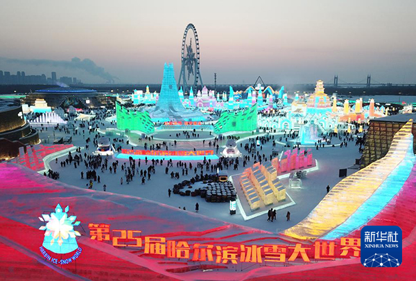 游客在哈尔滨冰雪大世界游玩(无人机照片,1月5日摄)。新华社记者 王建威 摄