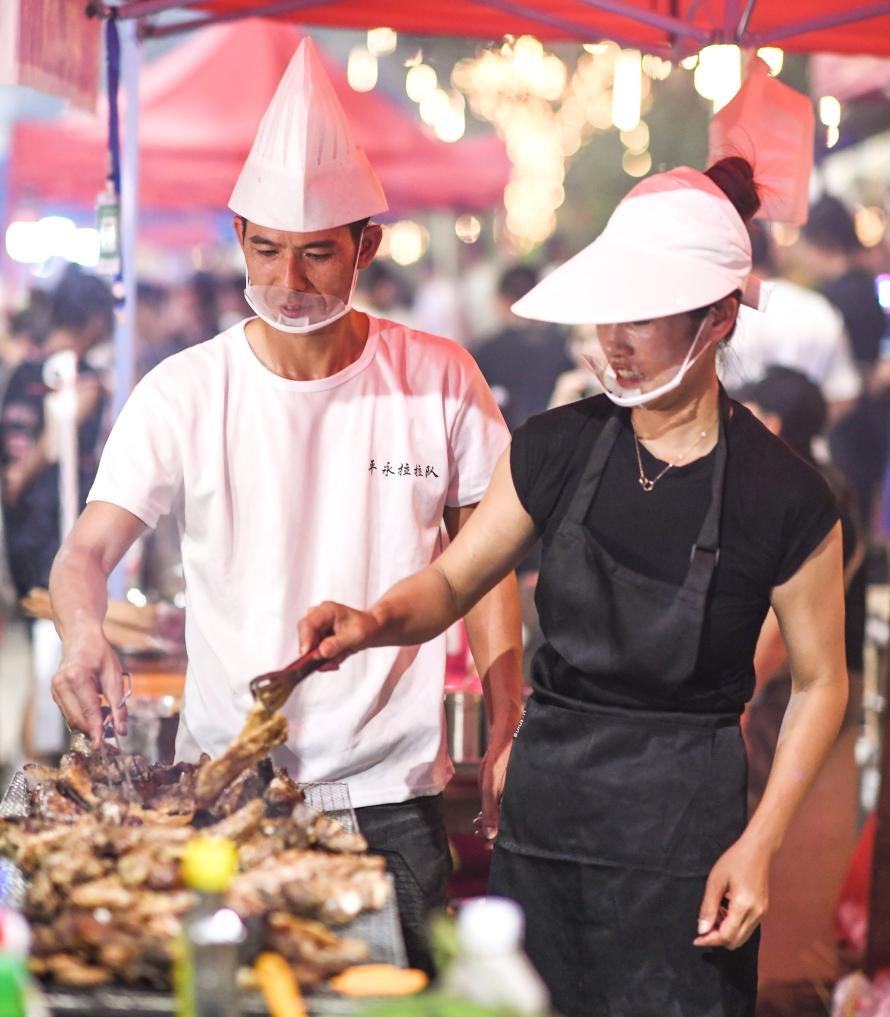 ↑2023年7月1日,一对夫妇在贵州“村超”足球赛场附近设置的摊点给游客烤排骨。