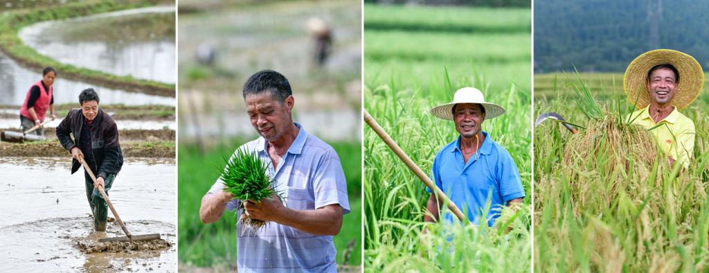 ↑拼版照片:从左至右为2023年4月6日,陈良东在水稻制种基地里平整田块,准备播种;5月29日,陈良东在移栽秧苗;8月1日,陈良东在水稻制种基地里拿着竹竿,准备给制种水稻“赶花”授粉;8月26日,陈良东展示收获的水稻种子。