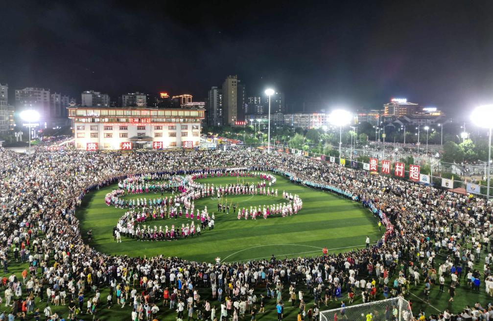 ↑2023年6月17日,村民在贵州“村超”足球赛开赛前表演民族舞蹈。