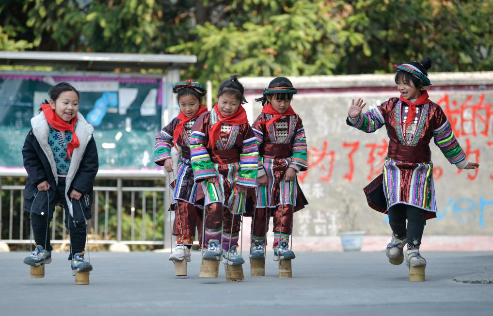 ↑2023年2月16日,贵州省从江县西山镇中寨教学点学生在课外活动中比赛踩高跷。