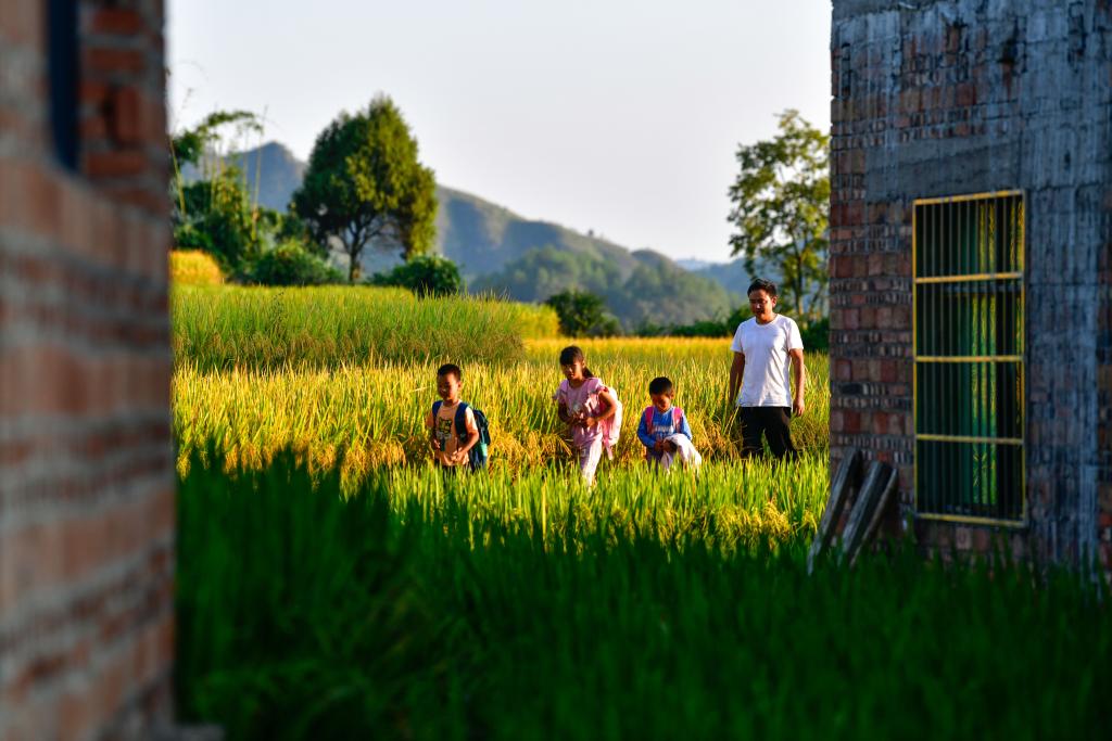 夕阳西下,远山苍茫。陆成文护送着路远的孩子们回家,秋日暖阳照在金色的稻田上,也照亮了师生身影。透过民居的两堵墙,构成自然的相框,我按下了快门,记录下乡村黄昏最美的模样。