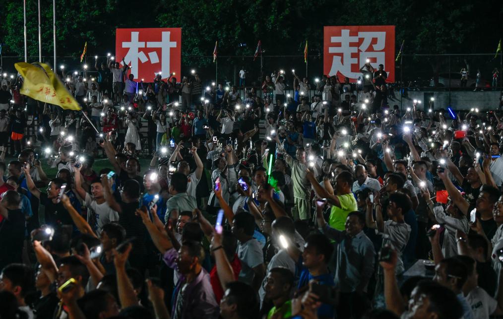 ↑2023年6月11日,人们在“村超”足球比赛现场打开手机灯光进行互动。