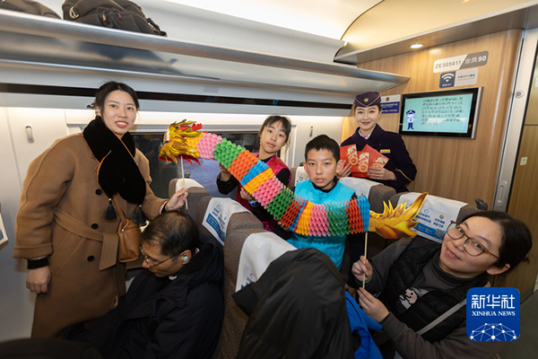 1月26日,旅客在G10次高铁车厢内舞动龙年装饰。新华社记者 王翔 摄