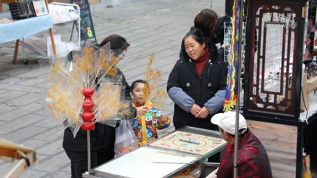 以勺为笔、以糖为墨,在大理石板上,糖画手艺人凭借一勺糖汁绘制糖画。抖、顿、放、收……只见其手法熟练,飞快地来回浇铸。不一会儿,祥龙造型的糖画便腾空出现,传递出甜甜的年味。