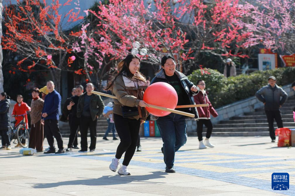 2月10日,人们在贵州省黔东南苗族侗族自治州剑河县阳光广场参加“龙行大运”运球游艺活动。新华社发(万文杰 摄)pagebreak