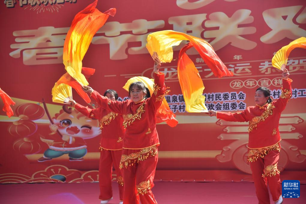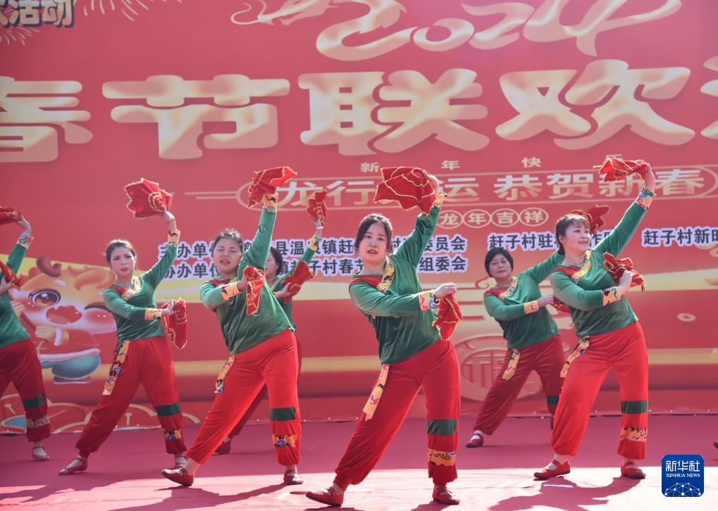 2月10日,贵州省贵阳市息烽县温泉镇赶子村村民在当地的春节联欢会上表演舞蹈《一起红火火》。新华社记者 骆飞 摄pagebreak