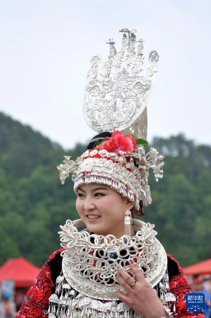 2月12日,在贵州省黔东南苗族侗族自治州台江县施洞镇偏寨村,苗族姑娘戴着龙图腾的银冠去参加跳芦笙民俗活动。新华社发(吴吉斌 摄)pagebreak