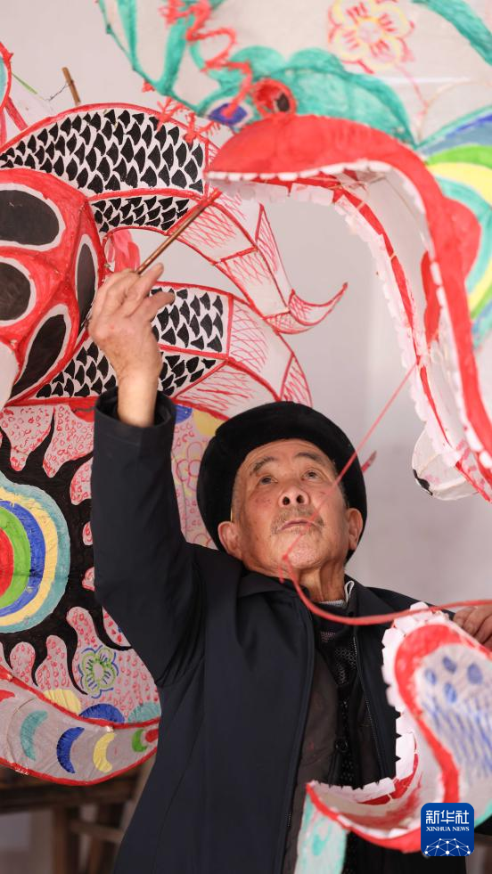 2月12日,民间艺人在贵州省铜仁市玉屏侗族自治县平溪街道红花村制作龙灯。新华社发(胡攀学 摄)