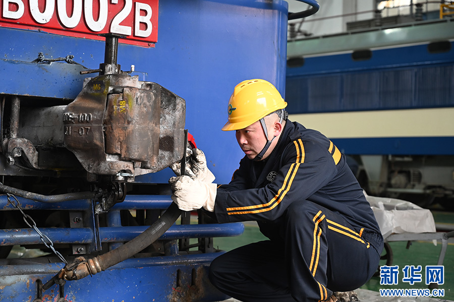 贵阳机务段职工在更换机车抱轴油表。新华网发(洪应龙 摄)pagebreak
