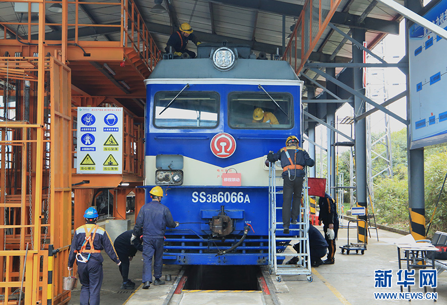 贵阳机务段职工在更换机车主变压器。新华网发(洪应龙 摄)pagebreak