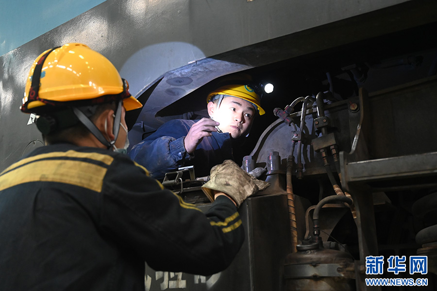 贵阳机务段职工在检修机车砂箱风管。新华网发(洪应龙 摄)