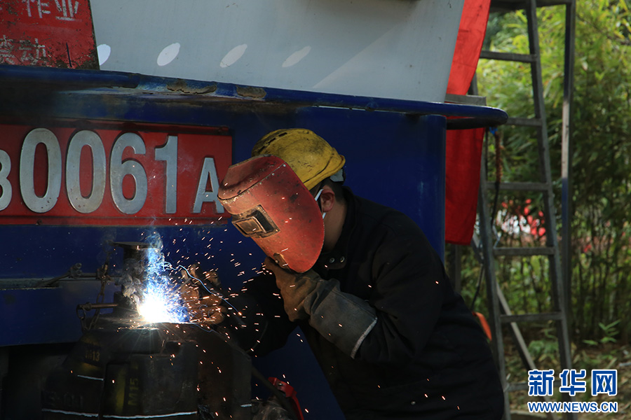 贵阳机务段职工在焊修机车车钩防跳装置。新华网发(洪应龙 摄)pagebreak