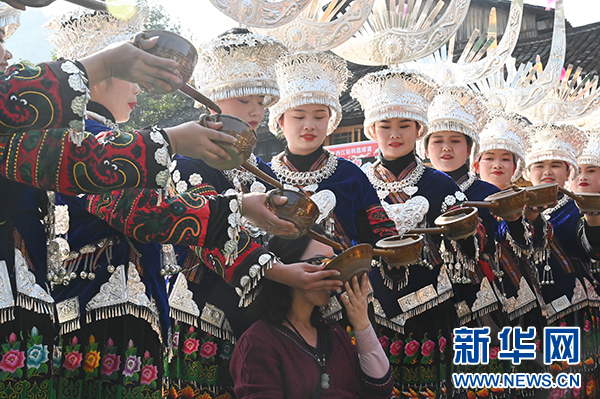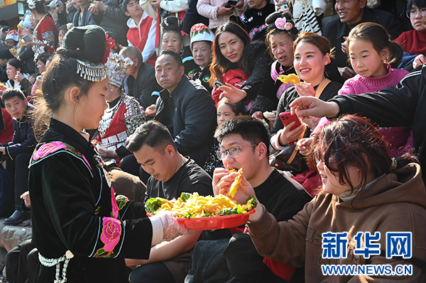 苗族小朋友和观众分享当地美食。新华网发(洪应龙 摄)