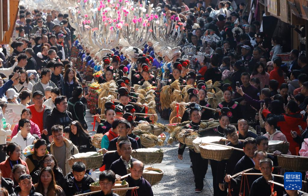2月13日,在贵州省黔东南苗族侗族自治州雷山县西江镇千户苗寨,游客观看“苗族姑妈回家”巡游队伍。