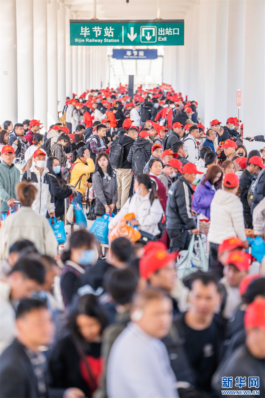 2月18日,外出务工人员排队进入成贵高铁毕节站。
