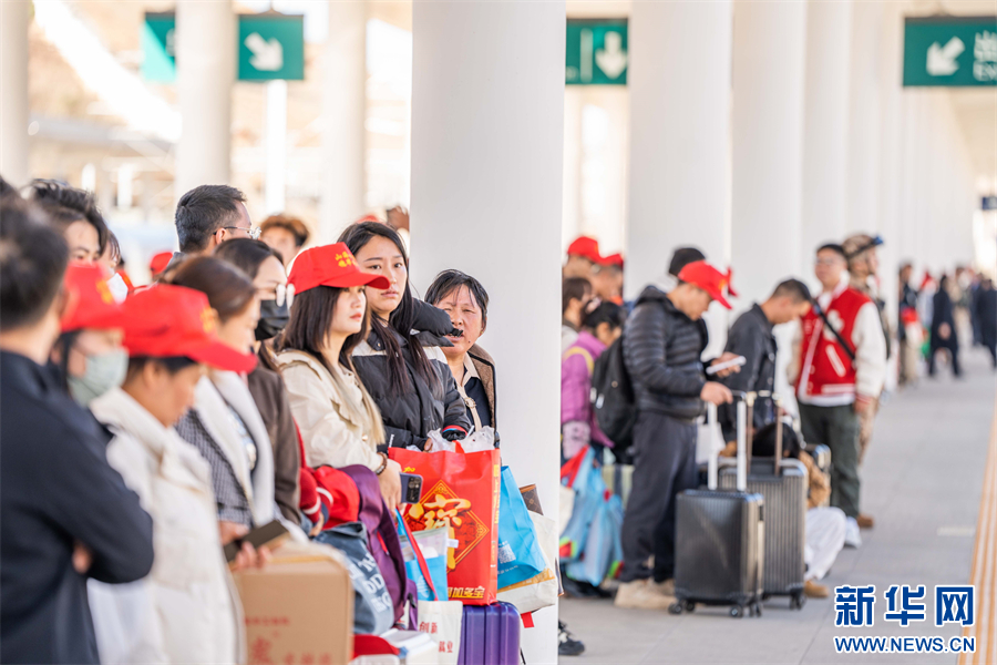 2月18日,外出务工人员在成贵高铁毕节站排队等待列车的到来。新华网发(罗大富 摄)pagebreak
