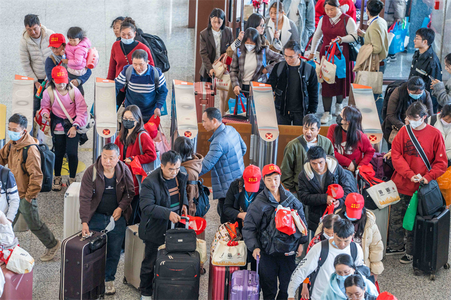 2月18日,外出务工人员在成贵高铁毕节站通过验票闸机。新华网发(罗大富 摄)pagebreak