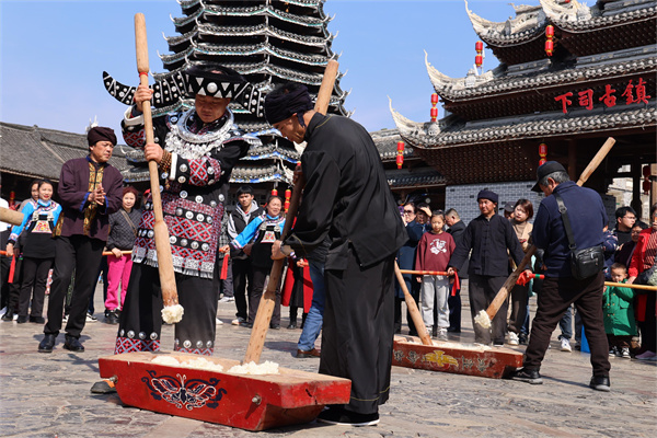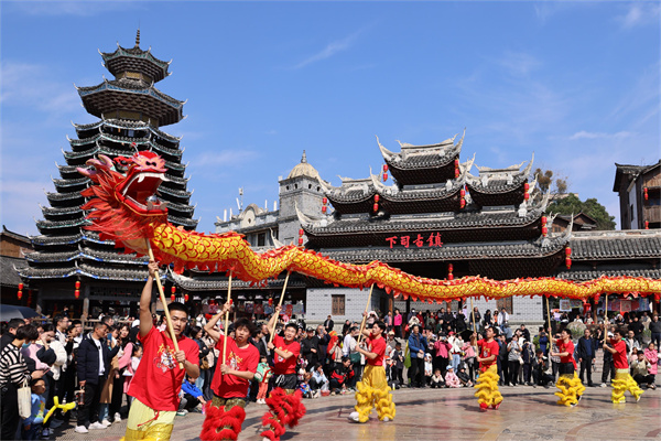 2月15日,当地群众在贵州省凯里市下司古镇景区表演苗族舞蹈。(陈丹 摄)