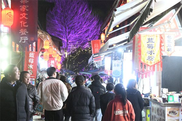 2月15日,爆棚的贵州省凯里市下司古镇景区特色美食街。(杨仁海 摄)