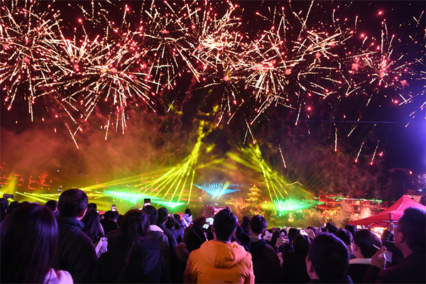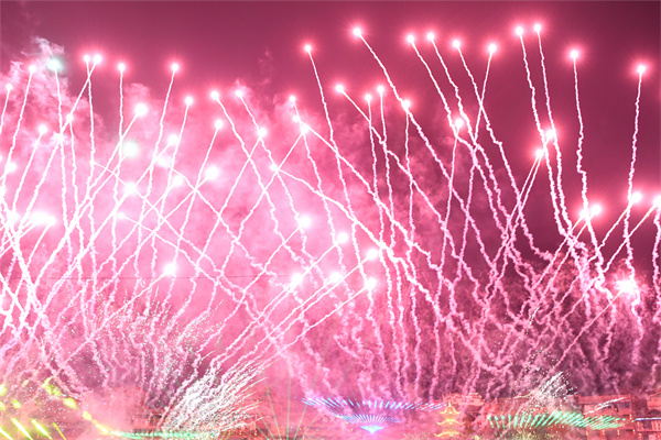 一会儿,景区上空,“凤凰”高飞,烟花绽放,瞬间将夜空变成了星空,五光十色,火树银花,一片欢呼雀跃,