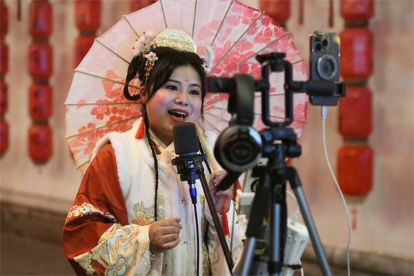 2月15日,一主播在贵州省凯里市下司古镇景区直播灯会。(杨仁海 摄)
