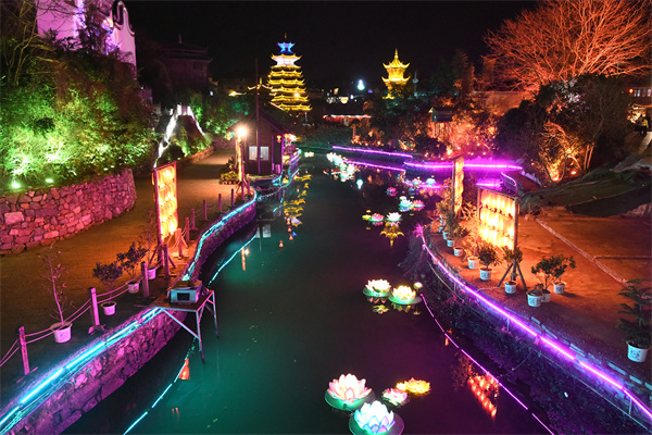 2月15日,流光溢彩的贵州省凯里市下司古镇景区水上舞台。(杨仁海 摄)