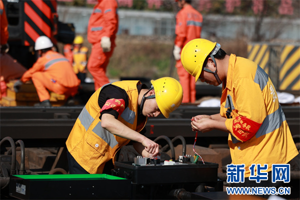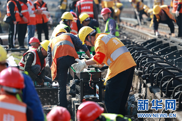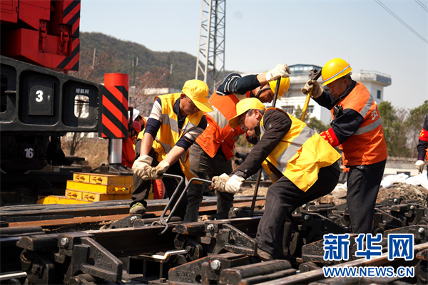 图为施工现场各工种人员密切协作。新华网发(国铁成都局供图)