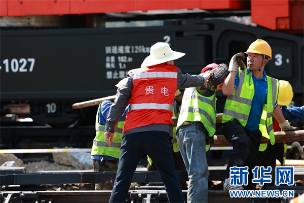 图为贵阳工务段作业人员进行钢轨牵拉作业。新华网发(国铁成都局供图)