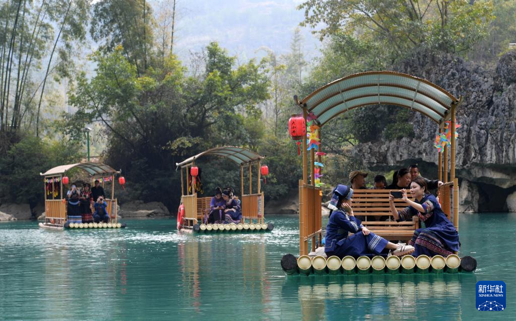 3月7日,游客在大井村大小井景区乘竹筏游览。新华社发(史传鸿 摄)pagebreak